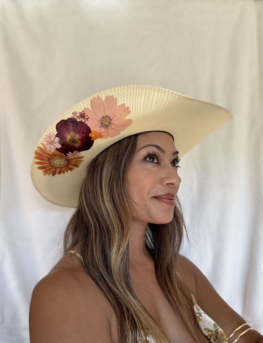This hat features natural, hand pressed flowers on one side of the (under) brim and is topped off with a premium leather hat band with dried flowers. Hat Size 6 7/8.